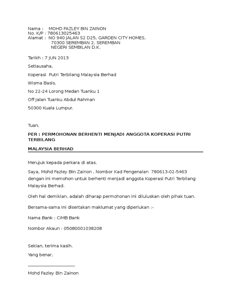 Contoh Surat Rasmi Berhenti Menjadi Ahli Koperasi Yebaran Otosection