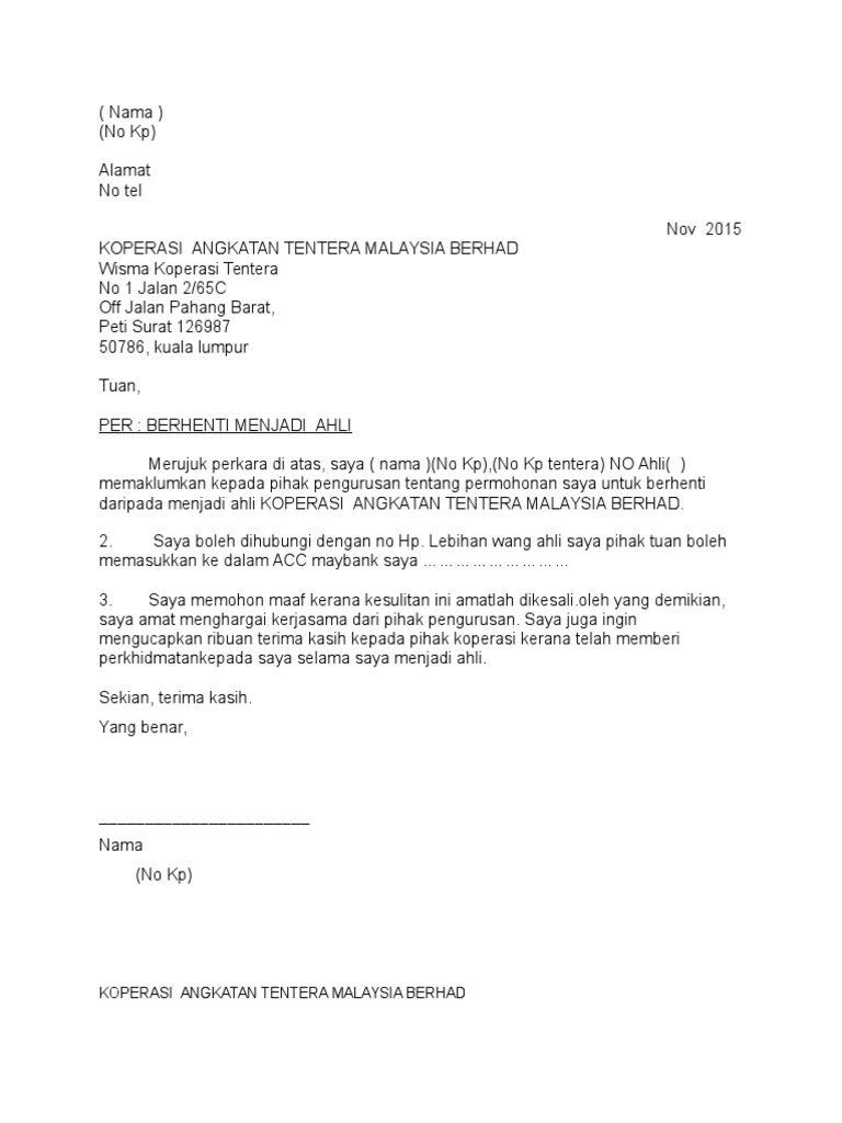 Perlu menulis gunakan bahasa yang mudah tepat dan padat. Pemberhentian potongan yuran dan saham anggota mengambil masa selama sebulan atau mengikut tarikh akhir yang dituntut oleh angkasa 3. Related posts to contoh surat rasmi berhenti menjadi ahli koperasi tentera contoh surat rasmi berhenti menjadi ahli koperasi tentera 2018 07 17t09 10 00 07 00 rating.